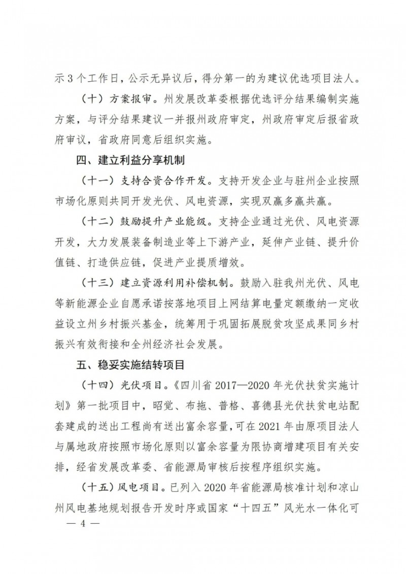 光伏項目。《四川省2017—2020 年光伏扶貧實施計 劃》第一批項目中,昭覺、布拖、普格、喜德縣光伏扶貧電站配 套建成的送出工程尚有送出富余容量,可在2021 年由原項目法人 與屬地政府按照市場化原則以富余容量為限協(xié)商增建項目有關(guān)安 排,經(jīng)省發(fā)展改革委、省能源局審核后按程序組織實施。