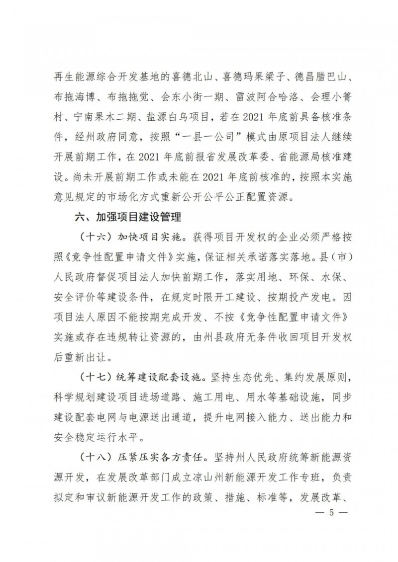 風(fēng)電項目。已列入2020 年省能源局核準(zhǔn)計劃和涼山州風(fēng)電基地規(guī)劃報告開發(fā)時序或國家“十四五”風(fēng)光水一體化可再生能源綜合開發(fā)基地的喜德北山、喜德瑪果梁子、德昌臘巴山、布拖海博、布拖拖覺、會東小街一期、雷波阿合哈洛、會理小箐村、寧南果木二期、鹽源白烏項目,若在2021 年底前具備核準(zhǔn)條 件,經(jīng)州政府同意,按照“一縣一公司”模式由原項目法人繼續(xù) 開展前期工作,在 2021 年底前報省發(fā)展改革委、省能源局核準(zhǔn)建 設(shè)。尚未開展前期工作或未能在2021年底前核準(zhǔn)的,按照本實施 意見規(guī)定的市場化方式重新公開公平公正配置資源。