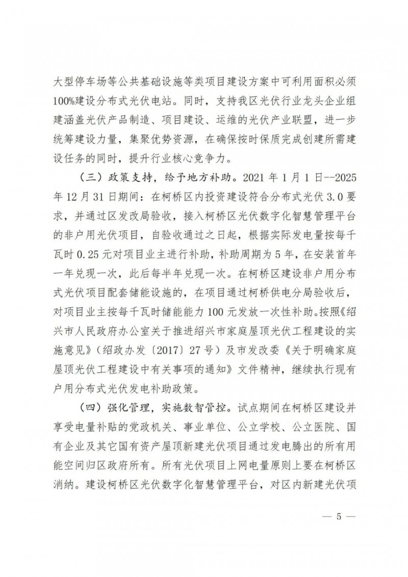 政策方面給予一定的地方補助,2021年1月1日--2025年12月31日期間:在柯橋區(qū)內(nèi)投資建設符合分布式光伏3.0要求,根據(jù)實際發(fā)電量按每千瓦時0.25元對項目業(yè)主進行補助,補助周期為5年,在安裝首年一年兌現(xiàn)一次,此后每半年兌現(xiàn)一次。在柯橋區(qū)建設非戶用分布式光伏項目配套儲能設施的,在項目通過柯橋供電分局驗收后,對項目業(yè)主按每千瓦時儲能能力100元發(fā)放一次性補助。