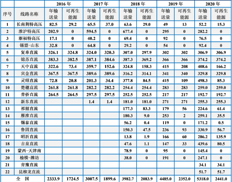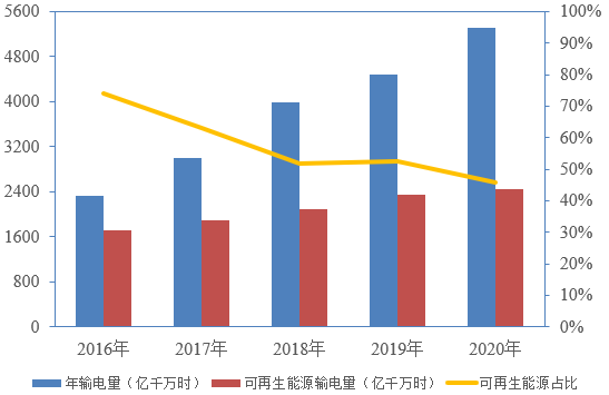 “十三五”期間,我國特高壓工程建設(shè)進(jìn)展迅速,特高壓線路輸送電量和輸送可再生能源電量逐年增加,“西電東送”工程穩(wěn)步向前,但輸送可再生能源電量的比重反而在下降,2020年我國22條特高壓輸送通道平均可再生能源占比為46%,創(chuàng)下近五年新低。2021年10月24日,國務(wù)院印發(fā)的《2030年前碳達(dá)峰行動方案》提出“嚴(yán)控跨區(qū)外送可再生能源電力配套煤電規(guī)模,新建通道可再生能源電量比例原則上不低于50%。”可以預(yù)見,隨著全社會對碳達(dá)峰、碳中和目標(biāo)形成共識以及國家政策引導(dǎo),清潔能源占比將持續(xù)提升。