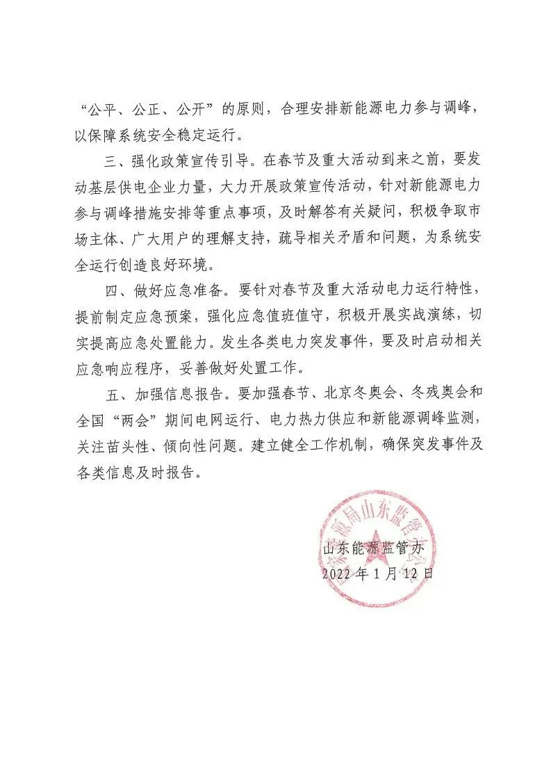 2022年1月22日,國家能源局山東監(jiān)管辦公室發(fā)布《關(guān)于做好 2022年春節(jié)及重大活動期間電網(wǎng)安全穩(wěn)定運行工作的通知》,提出: