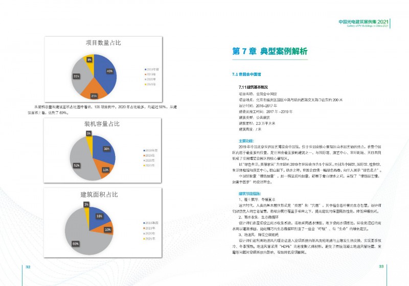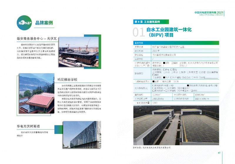 《案例集》分析和總結(jié)我國光電建筑應(yīng)用現(xiàn)狀、國內(nèi)外發(fā)展趨勢、技術(shù)要點等內(nèi)容,為行業(yè)發(fā)展提供基礎(chǔ)數(shù)據(jù)。經(jīng)過案例篩選,共收錄了105項光電建筑典型案例,涵蓋了我國工業(yè)建筑、公共建筑、辦公建筑、商業(yè)建筑、居住建筑及其他建筑類型光伏應(yīng)用,為光伏在建筑上大規(guī)模應(yīng)用提供了依據(jù)和參考價值。
