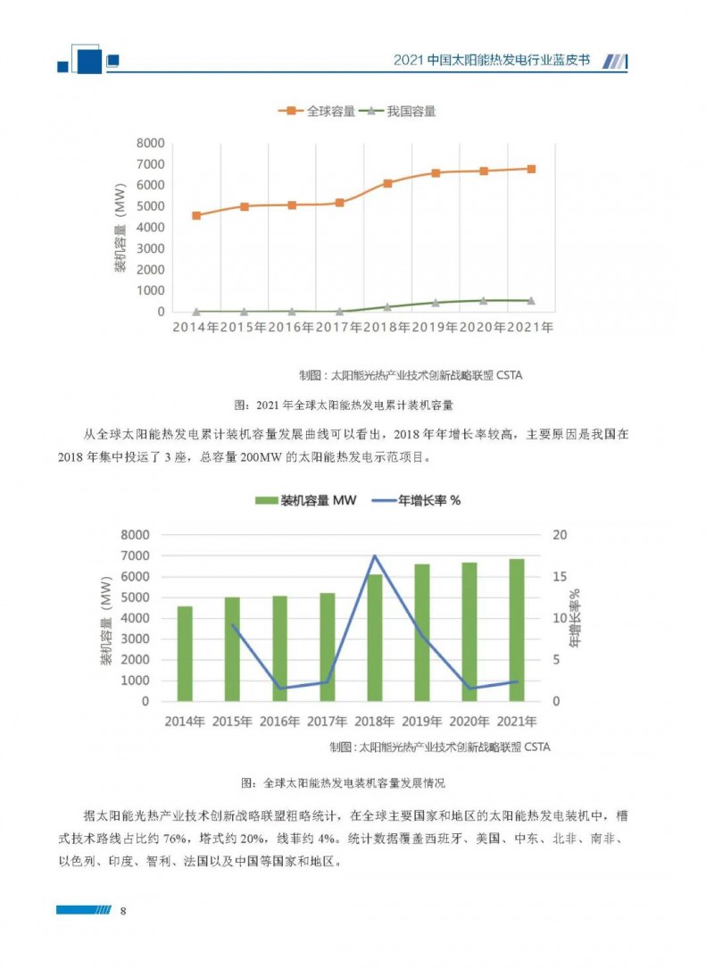 近日,由國家太陽能光熱產(chǎn)業(yè)技術(shù)創(chuàng)新戰(zhàn)略聯(lián)盟、中國可再生能源學(xué)會太陽能熱發(fā)電專業(yè)委員會、中關(guān)村新源太陽能熱利用技術(shù)服務(wù)中心聯(lián)合編制的《2021中國太陽能熱發(fā)電行業(yè)藍(lán)皮書》發(fā)布。
