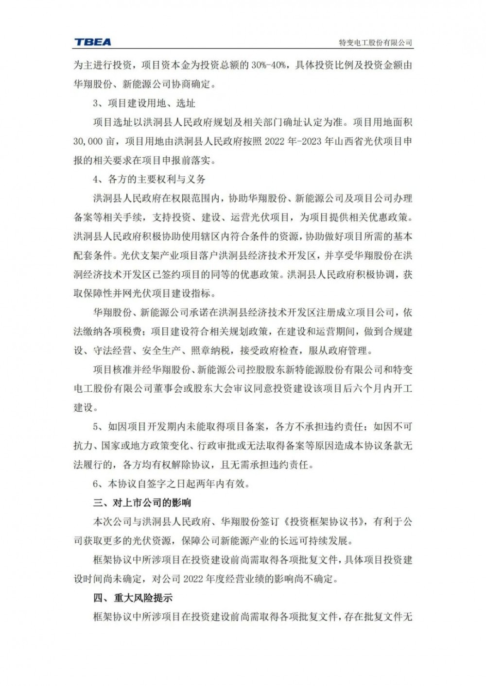 特變電工新能源、華翔股份將共同投資建設洪洞縣1GW光伏發(fā)電項目,配套光伏支架生產項目,項目總投資43億元。其中