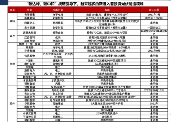近年來光伏產(chǎn)業(yè)發(fā)展迅速,疫情、產(chǎn)業(yè)鏈漲價等因素下仍屢創(chuàng)新高,跨界入局者屢見不鮮,成功者也不在少數(shù),前有華為的逆變器、比亞迪的組件,后有高景的硅片、金陽新能源的異質結,吉利、順豐、長城、同德化工、海螺水泥、和邦生物等實力玩家也紛紛入場。