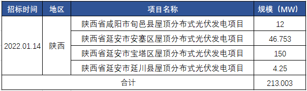 3月2日,國家電投集團陜西新能源有限公司縣域屋頂分布式光伏發(fā)電項目EPC總承包框架協(xié)議采購中標候選人公示。項目合計規(guī)模為213MW,陜西置能建工有限公司中標咸陽市旬邑縣12MW屋頂分布式項目,中能建三個子公司中標剩余201MW項目。所有項目均價為3.26元/W。
