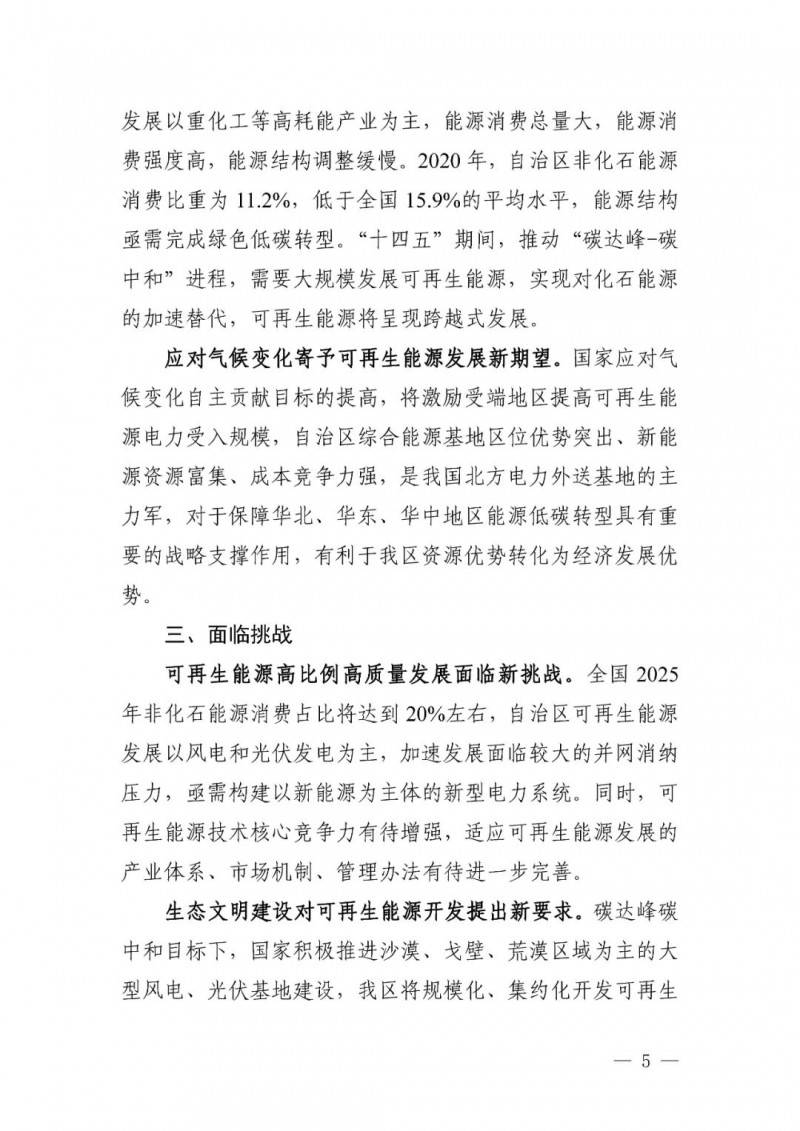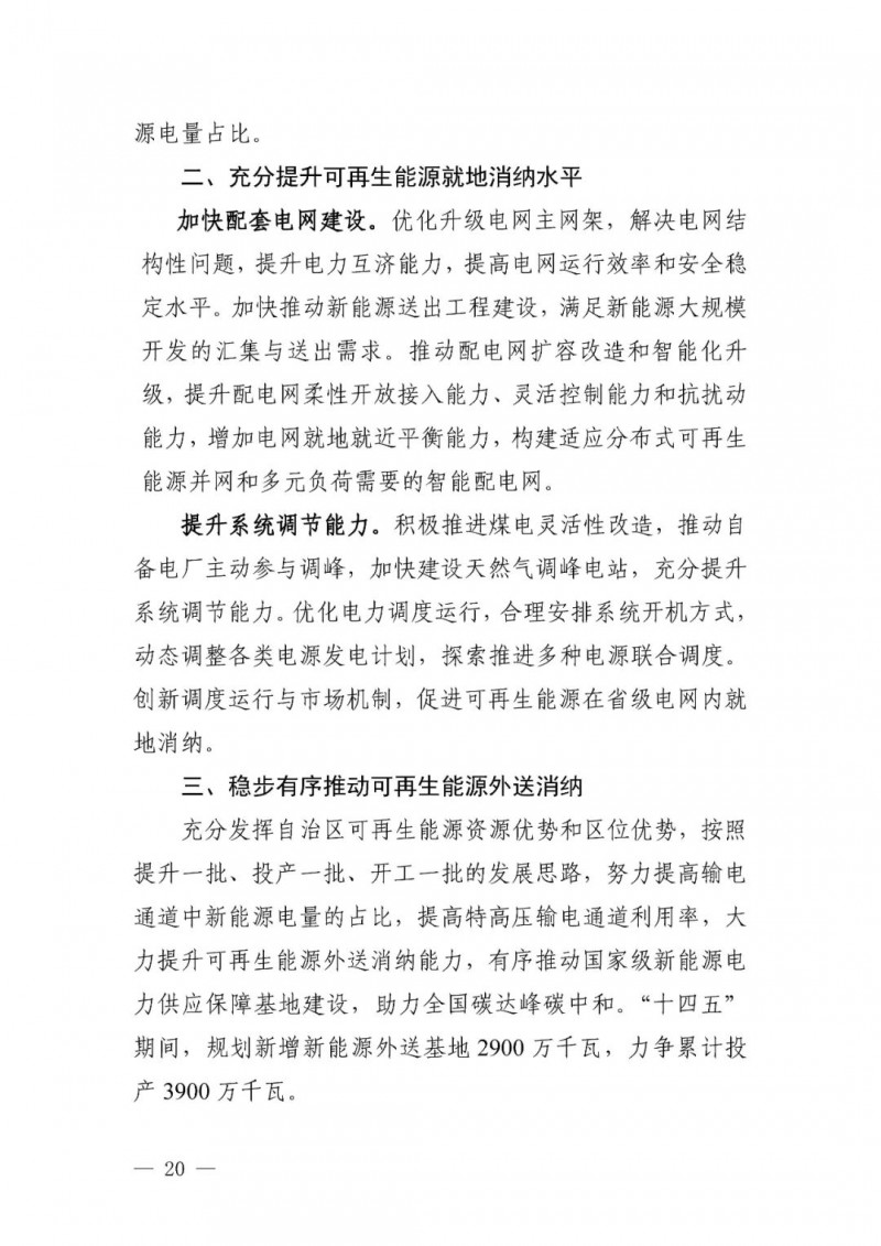 可再生能源發(fā)電目標(biāo)。自治區(qū)可再生能源發(fā)電裝機(jī)達(dá)到 1.35 億千瓦以上,其中風(fēng)電 8900 萬(wàn)千瓦、光伏發(fā)電 4500 萬(wàn)千瓦,新能源裝機(jī)規(guī)模超過(guò)燃煤火電裝機(jī)規(guī)模,新能源發(fā)電量占自治區(qū)總發(fā)電量比重超過(guò)35%。“十四五”期間可再生能源新增裝機(jī) 8000 萬(wàn)千瓦以上,占全部新增裝機(jī)的比重超過(guò) 60%,成為新增裝機(jī)的主力。