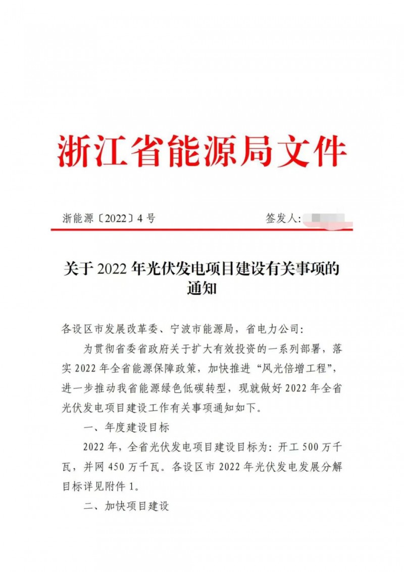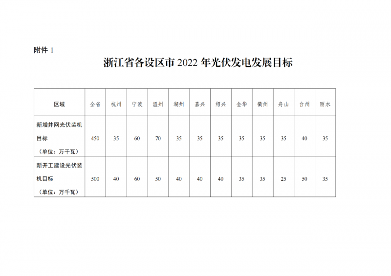 3月21日,浙江省能源局下發(fā)《關(guān)于2022年光伏發(fā)電項(xiàng)目建設(shè)有關(guān)事項(xiàng)的通知》,規(guī)劃2022年全省光伏建設(shè)目標(biāo)為并網(wǎng)4.5GW,開(kāi)工5GW,并對(duì)各市的光伏發(fā)電發(fā)展目標(biāo)進(jìn)行了分解。