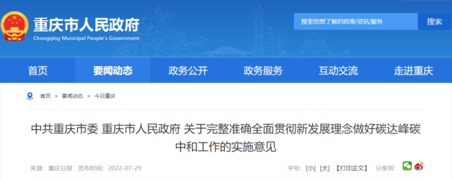 7月29日,中共重慶市委、重慶市人民政府出臺(tái)關(guān)于完整準(zhǔn)確全面貫徹新發(fā)展理念做好碳達(dá)峰碳中和工作的實(shí)施意見(jiàn)(以下簡(jiǎn)稱(chēng)“意見(jiàn)”)。