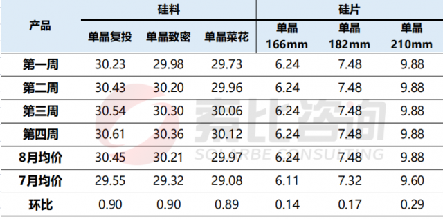 根據(jù)索比咨詢對多家硅片制造商的調(diào)研:就8月硅片價格行情來看,單晶166mm均價漲至6.24元/片,較7月環(huán)比上升2.1%;單晶182mm均價漲至7.48元/片,較7月環(huán)比上漲2.2%;單晶210mm均價漲至9.88元/W,較7月環(huán)比上升2.9%。
