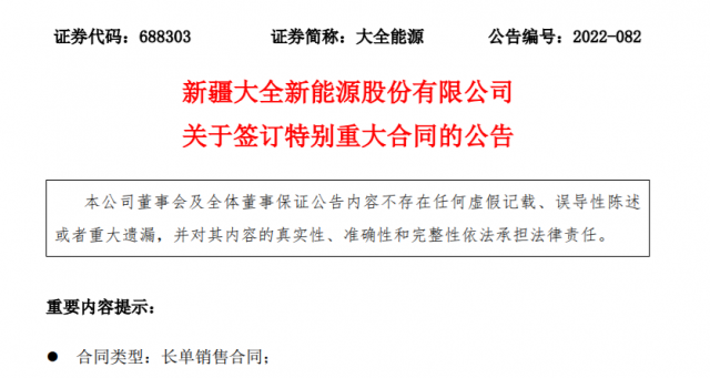 10月25日,大全能源公告,新疆大全新能源股份有限公司及全資子公司 內蒙古大全新能源有限公司近日與某客戶簽訂了 《采購框架合同》。