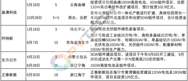 今年以來,以晶科能源、隆基綠能、天合光能、晶澳科技等為代表的行業(yè)第一梯隊(duì)主流組件大廠為鞏固各自市場地位、把握行業(yè)發(fā)展帶來的市場機(jī)遇,均在積極投資新建組件產(chǎn)能。