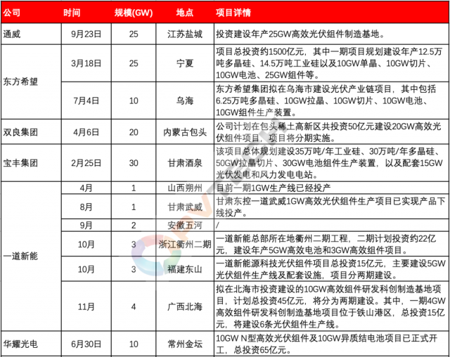 其中,晶科能源擴(kuò)張規(guī)模39GW、隆基綠能36GW、天合光能25GW、晶澳科技15GW、阿特斯13GW、東方日升18GW、正泰新能18GW,七家公司對外發(fā)布的投資新建組件規(guī)模已超160 GW。