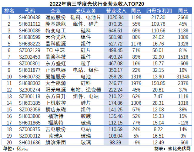 從營收規(guī)模來看,硅料和組件依然是創(chuàng)收能力最強的環(huán)節(jié)。而且,多數(shù)企業(yè)前三季度營業(yè)收入均已超過2021年全年,且創(chuàng)歷史新高。其中,通威股份營收規(guī)模首次突破千億大關(guān),達(dá)到1021億元;隆基綠能二、三季度邊際改善顯著,環(huán)比增速分別達(dá)到71%和15%,營收規(guī)模達(dá)到870.35億元;特變電工受益于硅料、煤炭產(chǎn)品的“量價齊升”,達(dá)到646.51億元。