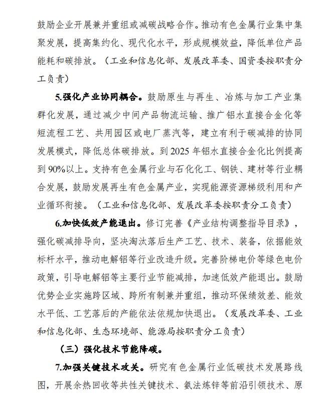 提高可再生能源使用比例,鼓勵(lì)企業(yè)在資源環(huán)境可承載的前提下向可再生能源富集地區(qū)有序轉(zhuǎn)移,逐步減少使用火電的電解鋁產(chǎn)能。利用電解鋁、工業(yè)硅等有色金屬生產(chǎn)用電量大、負(fù)荷穩(wěn)定等特點(diǎn),支持企業(yè)參與以消納可再生能源為主的微電網(wǎng)建設(shè),支持具備條件的園區(qū)開展新能源電力專線供電,提高消納能力。鼓勵(lì)和引導(dǎo)有色金屬企業(yè)通過綠色電力交易、購買綠色電力證書等方式積極消納可再生能源,確??稍偕茉措娏ο{責(zé)任權(quán)重高于本區(qū)域最低消納責(zé)任權(quán)重。力爭2025年、2030年電解鋁使用可再生能源比例分別達(dá)到25%、30%以上。