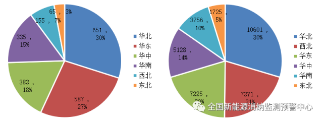 三季度各區(qū)域光伏新增(左)、累計(jì)(右)裝機(jī)(萬(wàn)千瓦)