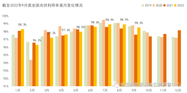 截至9月底全國(guó)光伏利用率逐月變化情況