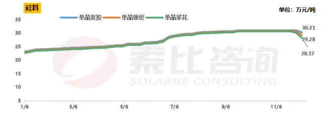 硅料價格連續(xù)兩周下跌,上周單晶復(fù)投均價30.31萬元/噸,單晶致密均價29.28萬元/噸,單晶菜花均價28.17萬元/噸。