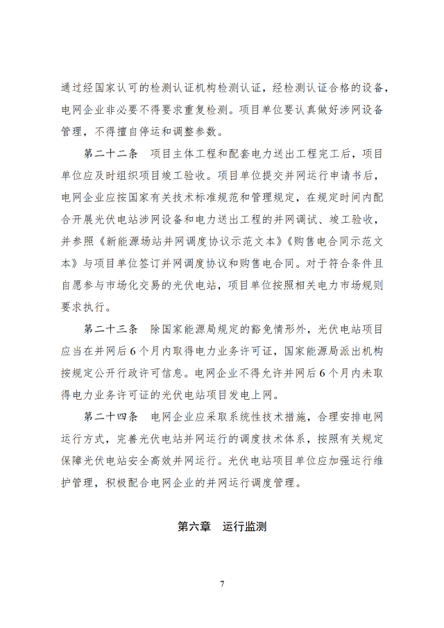 12月26日,國家能源局印發(fā)關(guān)于《光伏電站開發(fā)建設(shè)管理辦法》的通知,通知提到,國家能源局負(fù)責(zé)全國光伏電站開發(fā)建設(shè)和運(yùn)行的監(jiān)督管理工作,電網(wǎng)企業(yè)承擔(dān)光伏電站并網(wǎng)條件的落實(shí)或認(rèn)定、電網(wǎng)接入、調(diào)度能力優(yōu)化、電量收購等工作,配合各級(jí)能源主管部門分析測(cè)算電網(wǎng)消納能力與接入送出條件。有關(guān)方面按照國家法律法規(guī)和部門職責(zé)等規(guī)定做好光伏電站的安全生產(chǎn)監(jiān)督管理工作。