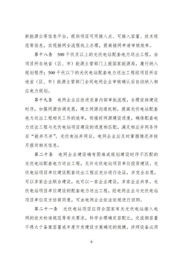 省級(jí)能源主管部門負(fù)責(zé)做好本省(區(qū)、市)可再生能源發(fā)展規(guī)劃與國家能源、可再生能源、電力等發(fā)展規(guī)劃和重大布局的銜接,根據(jù)本省(區(qū)、市)可再生能源發(fā)展規(guī)劃、非水電可再生能源電力消納責(zé)任權(quán)重以及電網(wǎng)接入與消納條件等,制定光伏電站年度開發(fā)建設(shè)方案。涉及跨省跨區(qū)外送消納的光伏電站,相關(guān)送受端省(區(qū)、市)能源主管部門在制定可再生能源發(fā)展規(guī)劃、年度開發(fā)建設(shè)方案時(shí)應(yīng)充分做好銜接。