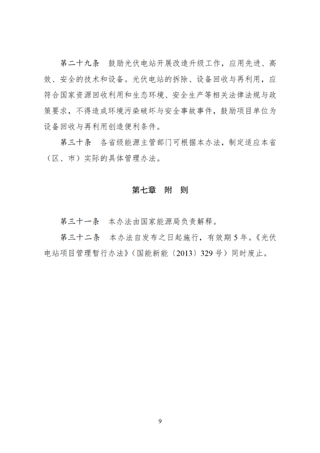 鼓勵(lì)光伏電站開展改造升級(jí)工作,應(yīng)用先進(jìn)、高效、安全的技術(shù)和設(shè)備。光伏電站的拆除、設(shè)備回收與再利用,應(yīng)符合國家資源回收利用和生態(tài)環(huán)境、安全生產(chǎn)等相關(guān)法律法規(guī)與政策要求,不得造成環(huán)境污染破壞與安全事故事件,鼓勵(lì)項(xiàng)目單位為設(shè)備回收與再利用創(chuàng)造便利條件。
