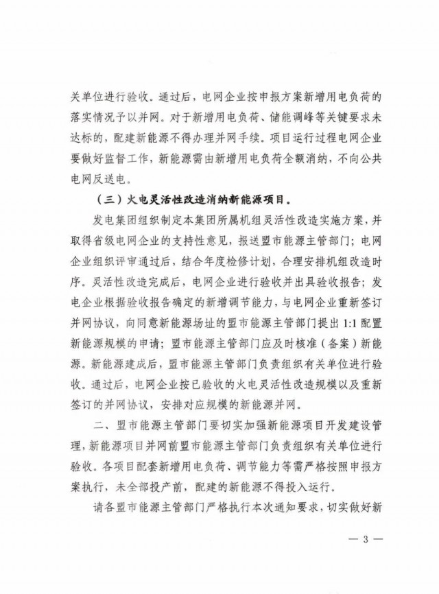 發(fā)電集團組織制定本集團所屬機組靈活性改造實施方案,并取得省級電網(wǎng)企業(yè)的支持性意見,報送盟市能源主管部門:電網(wǎng)企業(yè)組織評審?fù)ㄟ^后,結(jié)合年度檢修計劃,合理安排機組改造時序。靈活性改造完成后,電網(wǎng)企業(yè)進行驗收并出具驗收報告:發(fā)電企業(yè)根據(jù)驗收報告確定的新增調(diào)節(jié)能力,與電網(wǎng)企業(yè)重新簽訂并網(wǎng)協(xié)議,向同意新能源場址的盟市能源主管部門提出 1:1 配置新能源規(guī)模的申請;盟市能源主管部門應(yīng)及時核準(zhǔn)(備案)新能源。新能源建成后,盟市能源主管部門負責(zé)組織有關(guān)單位進行驗收。通過后,電網(wǎng)企業(yè)按已驗收的火電靈活性改造規(guī)模以及重新簽訂的并網(wǎng)協(xié)議,安排對應(yīng)規(guī)模的新能源并網(wǎng)。