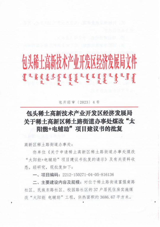 《稀土高新區(qū)稀土路街道辦事處煤改“太陽能電輔助”項目批復(fù)公示》