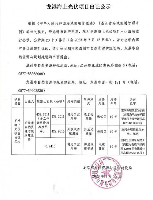 7月11日,浙江溫州市自然資源和規(guī)劃局對(duì)龍港海上光伏項(xiàng)目出讓海域進(jìn)行公示,擬出讓面積438.2611(含立體分層設(shè)權(quán)養(yǎng)殖用海)。