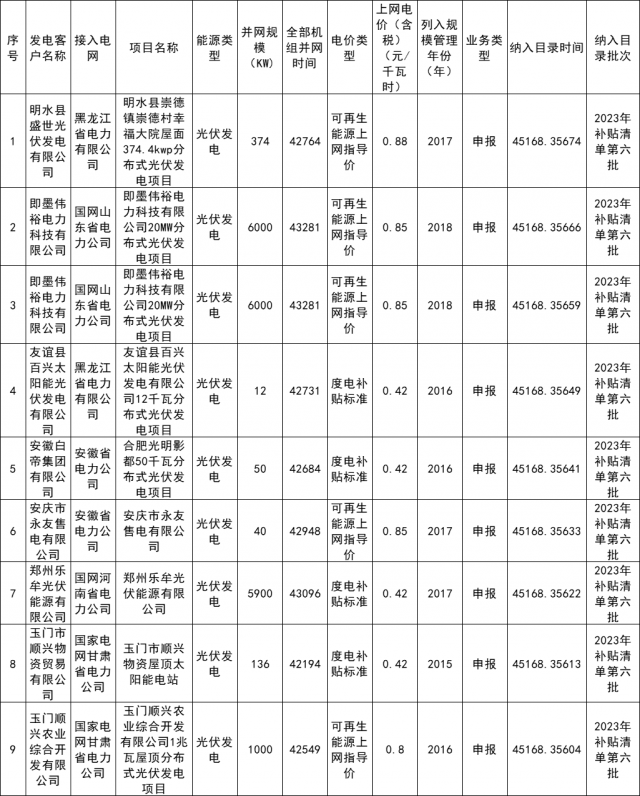 8月31日,國家電網(wǎng)發(fā)布《關(guān)于公布2023年第六批可再生能源發(fā)電補(bǔ)貼項(xiàng)目清單的報告》,此次納入2023年第六批可再生能源發(fā)電補(bǔ)貼清單的項(xiàng)目共11個,核準(zhǔn)/備案容量83.4MW。其中:集中式發(fā)電項(xiàng)目2個、核準(zhǔn)/備案容量50MW,分布式發(fā)電項(xiàng)目9個、核準(zhǔn)/備案容量33.4MW。