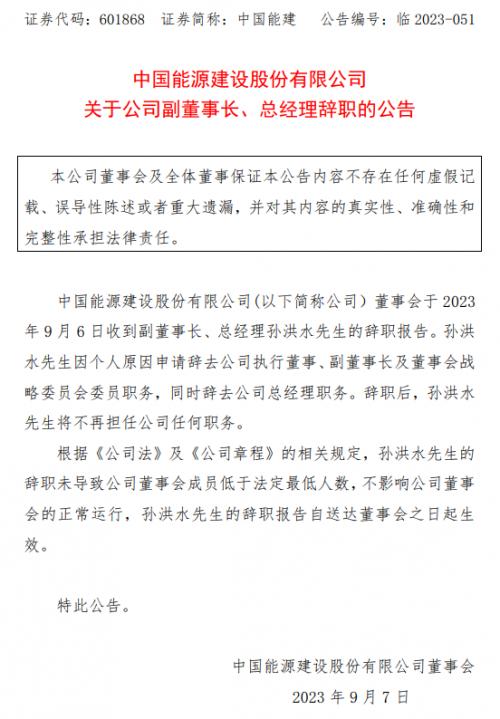 2023年9月6日,中國能建公告,公司董事會于2023年9月6日收到副董事長、總經(jīng)理孫洪水的辭職報告。孫洪水因個人原因申請辭去公司執(zhí)行董事、副董事長及董事會戰(zhàn)略委員會委員職務(wù),同時辭去公司總經(jīng)理職務(wù)。辭職后,孫洪水將不再擔(dān)任公司任何職務(wù)。