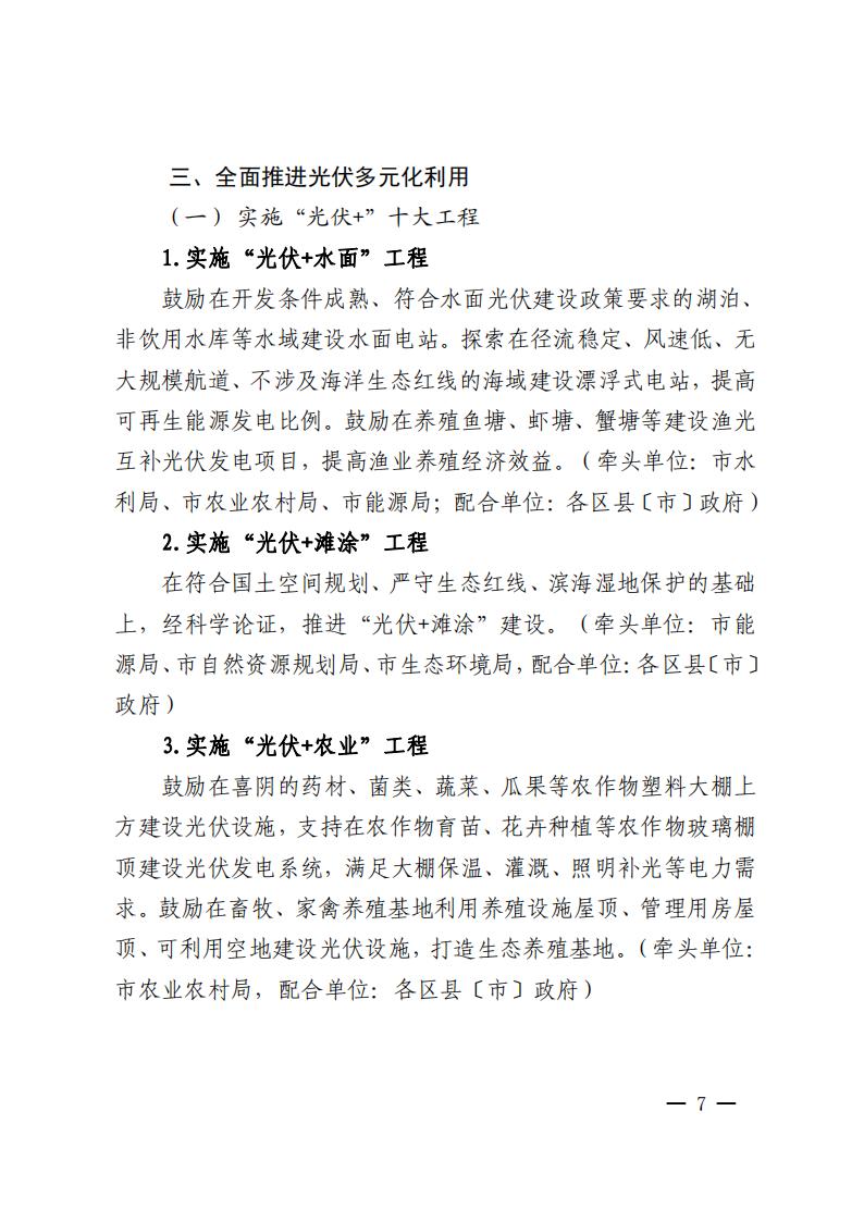 同時(shí)還提到全面推進(jìn)光伏多元化利用:實(shí)施“光伏+”十大工程,大力推進(jìn)整縣(市、區(qū))分布式光伏開發(fā),開展光伏資源排查等。