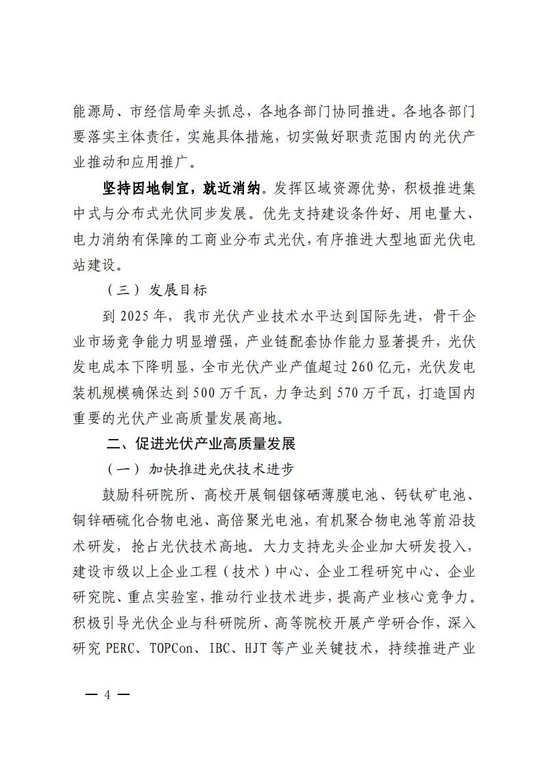 文件指出,到2025年,我市光伏產(chǎn)業(yè)技術(shù)水平達(dá)到國(guó)際先進(jìn),骨干企業(yè)市場(chǎng)競(jìng)爭(zhēng)能力明顯增強(qiáng),產(chǎn)業(yè)鏈配套協(xié)作能力顯著提升,光伏發(fā)電成本下降明顯,全市光伏產(chǎn)業(yè)產(chǎn)值超過260億元,光伏發(fā)電裝機(jī)規(guī)模確保達(dá)到500萬千瓦,力爭(zhēng)達(dá)到570萬千瓦,打造國(guó)內(nèi)重要的光伏產(chǎn)業(yè)高質(zhì)量發(fā)展高地。