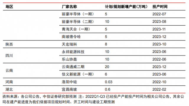 據(jù)悉,三氯氫硅為多晶硅生產及硅烷偶聯(lián)劑生產的必備原材料。中國為多晶硅的主要生產者,且新增產能主要集中于中國。多晶硅產能擴張十分迅速,中信證券王喆在10月11日發(fā)布的研報中統(tǒng)計得到,2022年新增產能將達約70萬噸,2023 年預計新增產能約164萬噸。