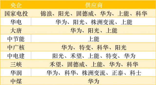 從各企業(yè)的央企拿單實力來看,第一梯隊的華為、陽光、上能最為突出,華為的主要央企客戶有華電、大唐、中廣核、華潤等;陽光主要央企客戶為中電建、華電、大唐、國家電投;上能主要央企客戶有中節(jié)能、國家電投、華電等。