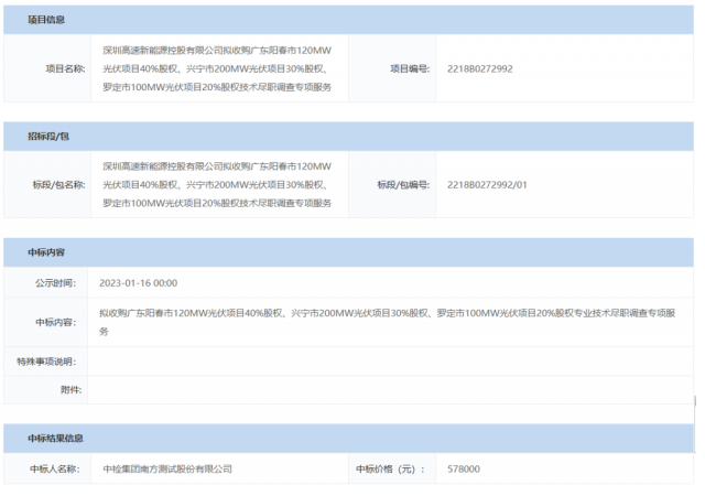 1月30日,深圳高速新能源控股有限公司公示了擬收購廣東陽春市120MW光伏項目40%股權(quán)、興寧市200MW光伏項目30%股權(quán)、羅定市100MW光伏項目20%股權(quán)技術(shù)盡職調(diào)查的中標(biāo)候選人,中檢集團(tuán)南方測試股份有限公司以57.8萬元的報價中標(biāo)。