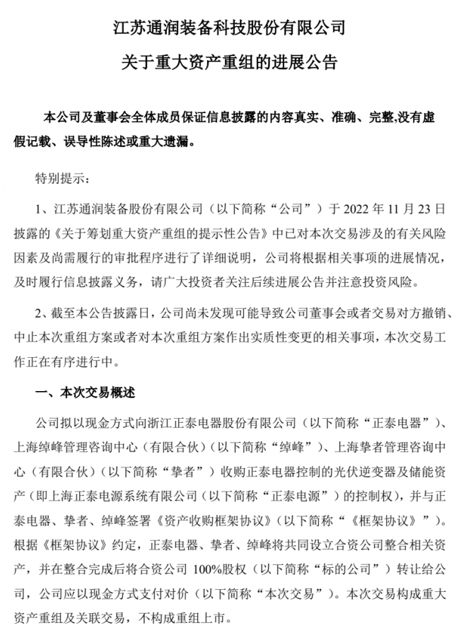 2022年11月23日,公司按照《深圳證券交易所上市公司自律監(jiān)管指引第8號—重大資產(chǎn)重組》規(guī)則要求披露了《江蘇通潤裝備股份有限公司關于籌劃重大資產(chǎn)重組的提示性公告》。