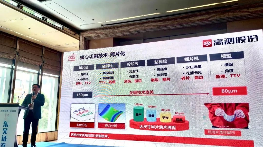 5月12日,高測股份在東吳證券2023年新技術(shù)系列會議上分享了公司的超薄半片硅片進展,并首次展示60μm超薄硅片。