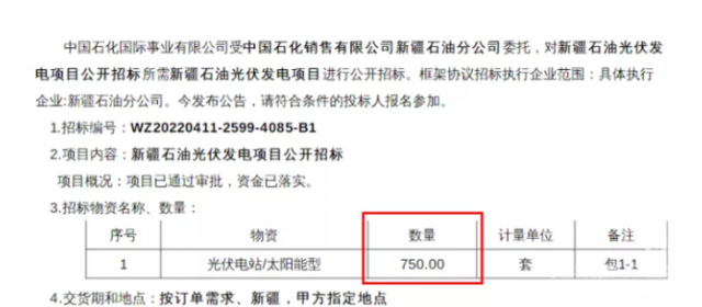 2022年4月1日,中國石化銷售有限公司新疆石油分公司公開招標(biāo)750套新疆石油光伏發(fā)電項目。