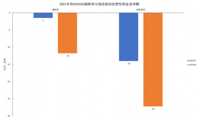 而且,隨著經(jīng)營規(guī)模的擴(kuò)大,企業(yè)的營運(yùn)壓力也不斷提升。截至2022Q3,福斯特和海優(yōu)新材的應(yīng)收賬款較2021年全年提高32%和52%,預(yù)付款項提高195%和347%。而流動比率則下降53%和25%,經(jīng)營性現(xiàn)金流更是呈凈流出態(tài)勢,且規(guī)模顯著提升,分別達(dá)到11.76億元和27.20億元,降幅高達(dá)695%和94%。