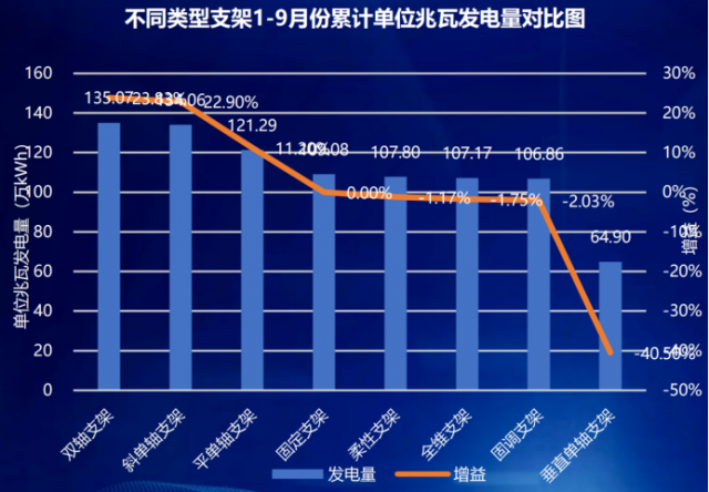 從支架實(shí)證數(shù)據(jù)分析,前三季度整體來(lái)看雙軸跟蹤系統(tǒng)發(fā)電量最高,斜單軸和平單軸次之,分別較固定支架發(fā)電量增益依次為23.83%、22.89%和11.2%;全維支架第一季度和第二季度由于支架跟蹤故障,正面輻照較低,7月份開(kāi)始正常運(yùn)行后發(fā)電量明顯提高,第三季度發(fā)電量最高;另外,柔性支架總體發(fā)電量略低于固定支架,兩種柔性支架之間發(fā)電量一致性相對(duì)較差,累計(jì)發(fā)電量差1.8%。同時(shí),從實(shí)證出力曲線來(lái)看,跟蹤支架與固定支架、柔性支架相比功率曲線更加偏平,對(duì)電力系統(tǒng)更加友好。