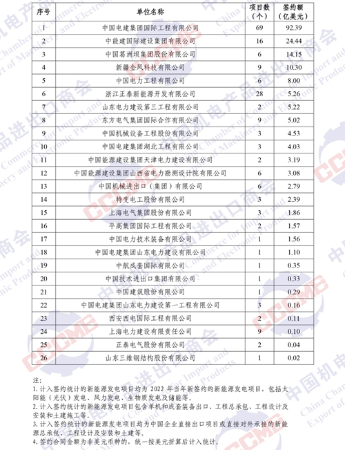 根據(jù)中國機(jī)電商會(huì)統(tǒng)計(jì),2022年,中國企業(yè)參與境外電力項(xiàng)目投(議)標(biāo)并最終實(shí)現(xiàn)簽約的項(xiàng)目517個(gè),簽約合同總金額339.93億美元,總裝機(jī)容量約33.5GW。根據(jù)各重點(diǎn)企業(yè)報(bào)送的2022年境外電力項(xiàng)目的新簽約情況,中國機(jī)電商會(huì)對(duì)企業(yè)簽約額進(jìn)行了排名?,F(xiàn)將企業(yè)排名及火電、水電、輸變電、新能源(太陽能、風(fēng)、生物質(zhì)、儲(chǔ)能等)及太陽能(光伏)、風(fēng)電行業(yè)簽約排名予以發(fā)布。