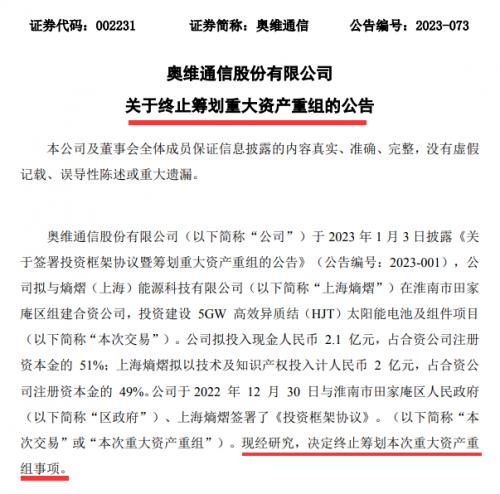 近日,奧維通信發(fā)布公告稱,公司原擬與熵熠(上海)能源科技有限公司(以下簡(jiǎn)稱“上海熵熠”)在淮南市田家庵區(qū)組建合資公司,投資建設(shè)5GW高效異質(zhì)結(jié)(HJT)太陽(yáng)能電池及組件項(xiàng)目。鑒于交易各方未能就交易對(duì)價(jià)、業(yè)績(jī)承諾、投后管理等交易方案的核心條款達(dá)成一致意見(jiàn),為保證各方的利益,決定終止本次重大資產(chǎn)重組事項(xiàng)。