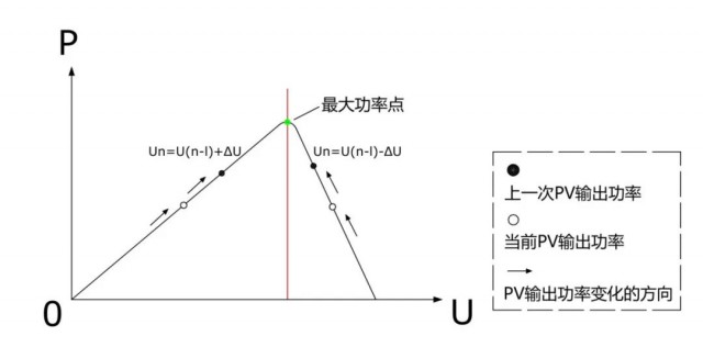 逆變器通過測(cè)量電流、電壓和功率,判斷出當(dāng)前工作點(diǎn)與峰值點(diǎn)的位置關(guān)系,智能調(diào)節(jié)工作點(diǎn)電壓(或電流),使其向峰值功率點(diǎn)靠攏,從而使光伏系統(tǒng)始終保持運(yùn)行在峰值功率點(diǎn)附近。