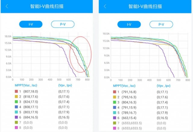 一旦組件發(fā)生陰影遮擋、損壞或者接觸不良等情況時(shí),組件和組串的I/V曲線都會(huì)發(fā)生明顯的變化。