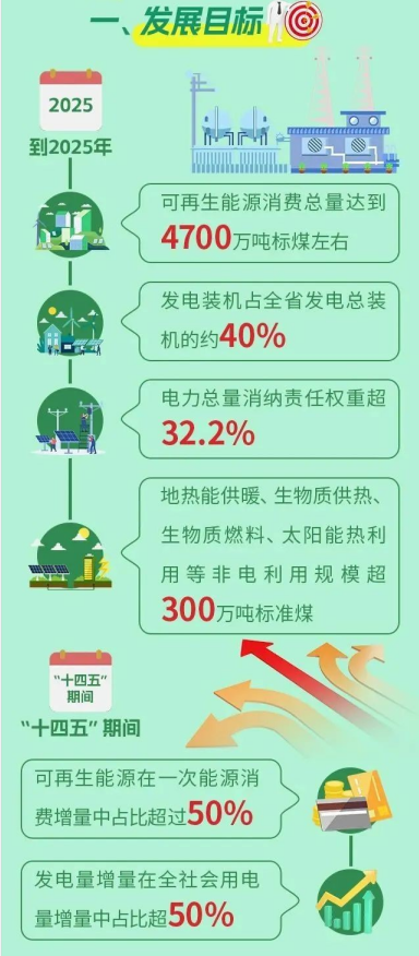 ——可再生能源發(fā)電目標(biāo)。2025年,可再生能源發(fā)電裝機(jī)達(dá)到5500萬(wàn)千瓦以上,占全省發(fā)電總裝機(jī)的40%左右;可再生能源年發(fā)電量達(dá)到1000億千瓦時(shí)左右?!笆奈濉逼陂g,可再生能源發(fā)電量增量在全社會(huì)用電量增量中的占比超過(guò)50%。