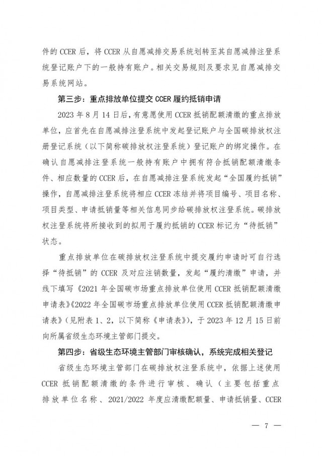 組織有意愿使用CCER抵銷碳排放配額清繳的重點排放單位抓緊開立賬戶,盡快完成CCER購買并申請抵銷,抵銷比例不超過對應年度應清繳配額量的5%。對第一個履約周期出于履約目的已注銷但實際未用于抵銷清繳的CCER,由重點排放單位申請,可用于抵銷2021、2022年度配額清繳。