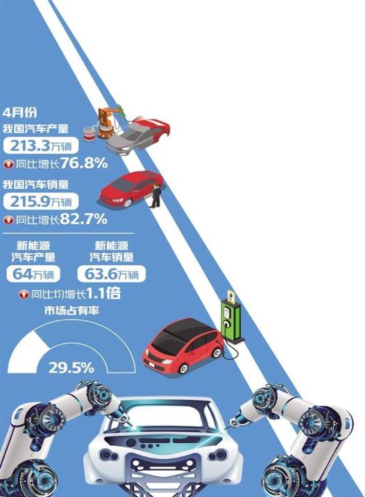 伴隨宏觀經(jīng)濟持續(xù)恢復(fù)向好,市場需求逐步回暖,汽車消費需求有望進一步釋放。中汽協(xié)發(fā)布數(shù)據(jù)顯示,4月份,我國汽車產(chǎn)銷分別完成213.3萬輛和215.9萬輛,同比分別增長76.8%和82.7%。其中,新能源汽車產(chǎn)銷和汽車出口延續(xù)良好態(tài)勢。