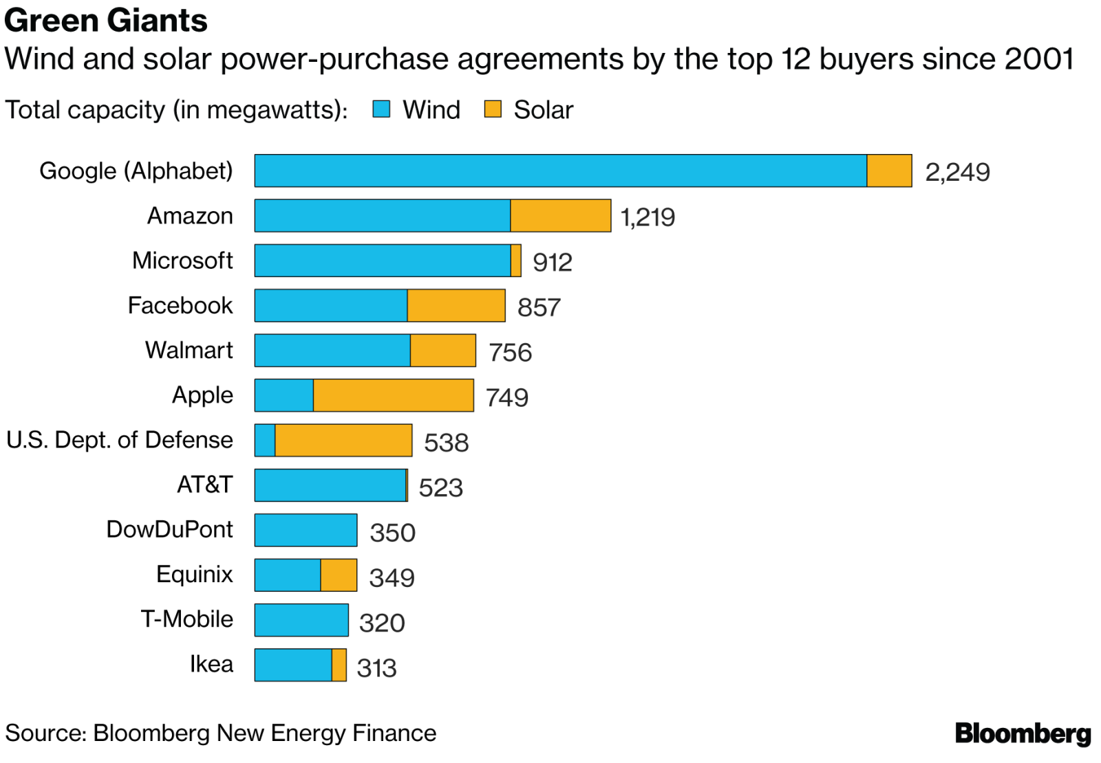 據(jù)彭博社新能源財經(jīng)報道,全球企業(yè)清潔電力交易市場正在蓬勃發(fā)展,全球各地的公司今年已簽署3.3吉瓦的協(xié)議。在美國,科技巨頭一直是最大的買家。