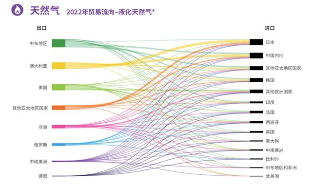 2022年,國(guó)際液化天然氣貿(mào)易量占所有地區(qū)間天然氣貿(mào)易量的56%,總量達(dá)到5,420億立方米,較上一年增長(zhǎng)5%。中東地區(qū)是最大的液化天然氣出口地區(qū),與澳大利亞和美國(guó)合計(jì)占液化天然氣出口總量的65%。日本是最大的液化天然氣進(jìn)口國(guó),進(jìn)口量達(dá)980億立方米,與中國(guó)合計(jì)占全球進(jìn)口總量的35%。亞太地區(qū)的進(jìn)口量約占液化天然氣進(jìn)口總量的65%,歐洲地區(qū)緊隨其后,占比超過(guò)30%。