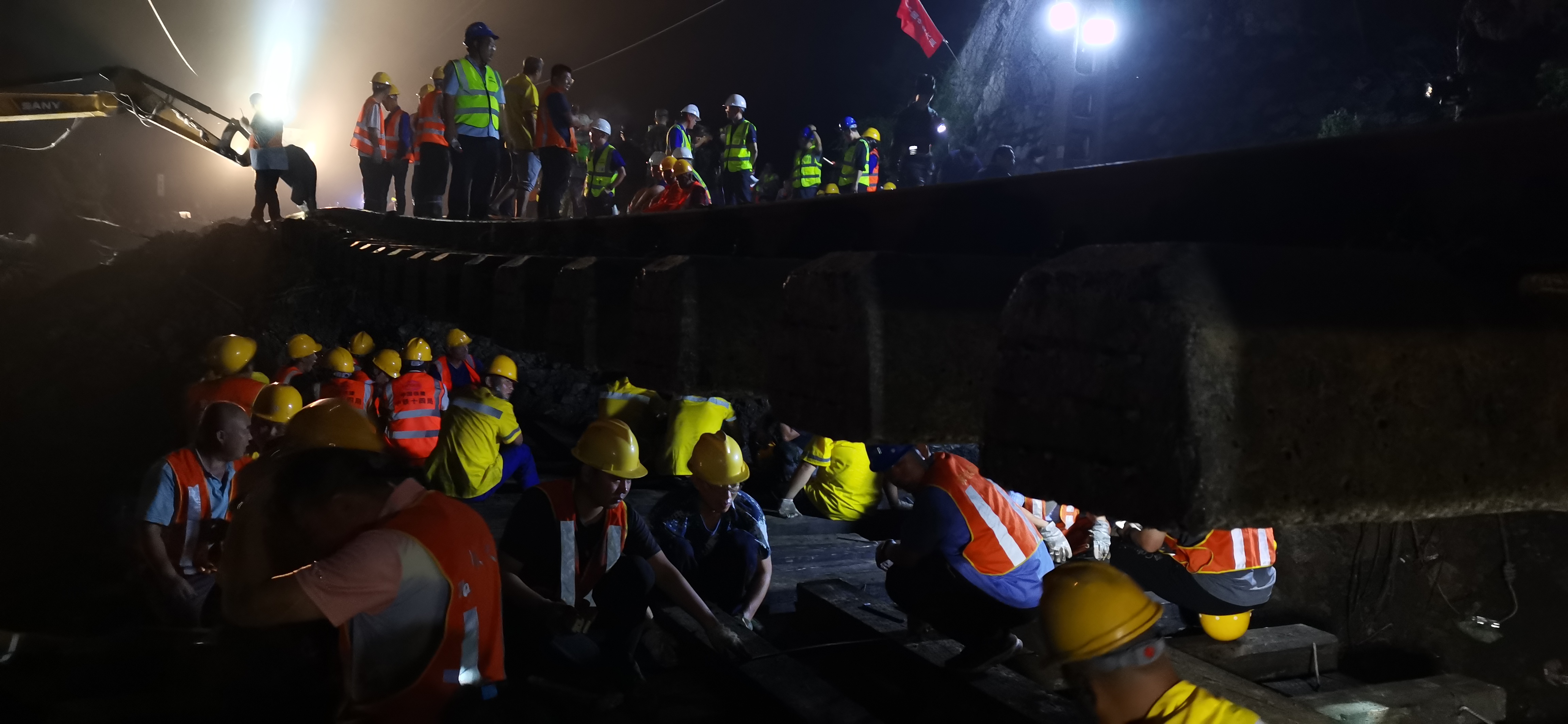 中鐵十四局調集300余名職工組成7支救援隊,連夜翻山越嶺抵達搶險一線,8月3日凌晨,在峽谷塌方前,組成“人墻”護欄,幫助Z180次列車503名乘客疏散到安全地帶。